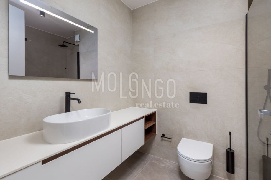 Stan se sastoji od hodnika, WC-a, dnevnog boravka s kuhinjom i blagavaonom, dvije sobe i dvije kupaonice, balkona, te dva parkirna mjesta u podzemnoj garaži.