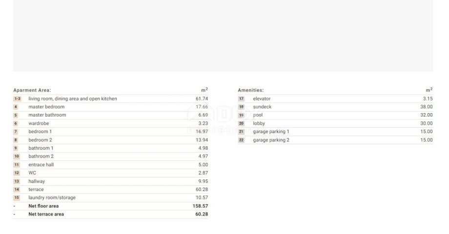 Stan 3 prostire se po cijeloj etaži zgrade veličine 158.57m2 na prvom katu zgrade te se sastoji od hodnika, tri velike spavaće sobe, tri kupaonice, WC, vešeraja, dnevni boravak s kuhinjom + blagovaonica čak 62m2 te privatna terasa 60m2. Zgrada u prizemlju raspolaže s egzotičnim bazenom i njegovim sunčalištem.