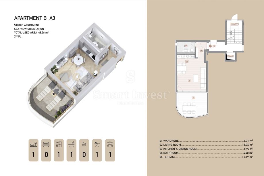 Posjedovanje stana u ovom vrhunskom kompleksu pruža vam udoban i moderan životni prostor te luksuz mikrolokacije koja besprijekorno integrira blizinu obližnjih plaža, kulinarskih užitaka u renomiranim restoranima, opuštajuće trenutke u SPA i fitnessu, kao i blizinu raznolikog spektra butika i trgovina. To je stil života koji kombinira praktičnost s privlačnošću života na obali.