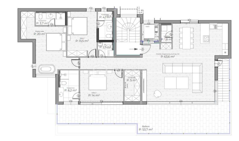 ▪ hodnik, open space kuhinja / blagovaona / dnevni boravak, utility soba, toalet, tri spavaće sobe svaka sa svojom kupaonom te garderoba u jednoj od spavaćih soba.