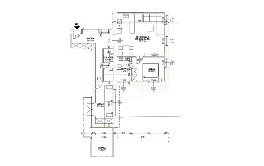 APARTMAN A6 ukupne površine 90.36 m2, kompletno opremljen dizajnerskim namještajem i vrhunskom tehnikom, smješten je na 1. katu te se sastoji od hodnika, dnevnog boravka s kuhinjom i blagovaonicom, 2 spavaće sobe, 2 kupaonice, te prostrane terase od 14.15 m2.