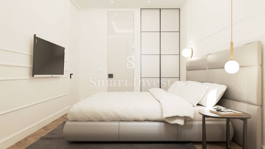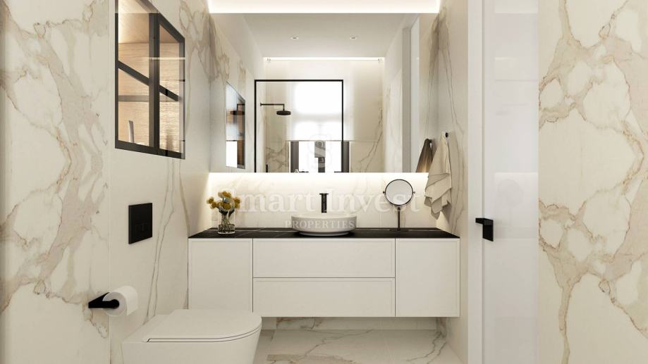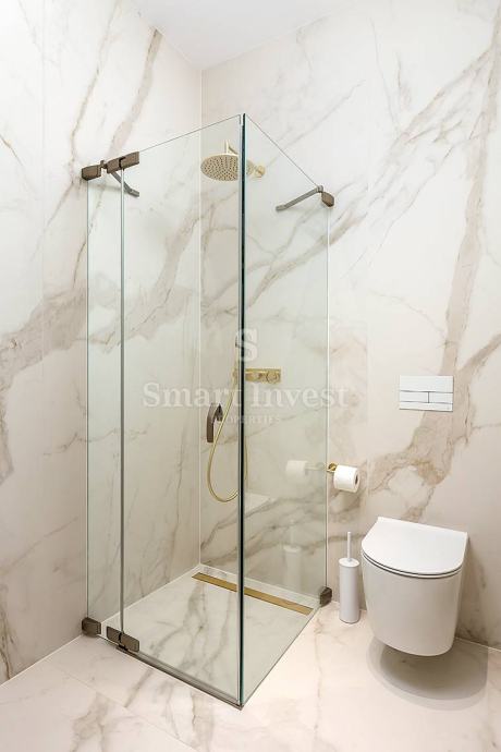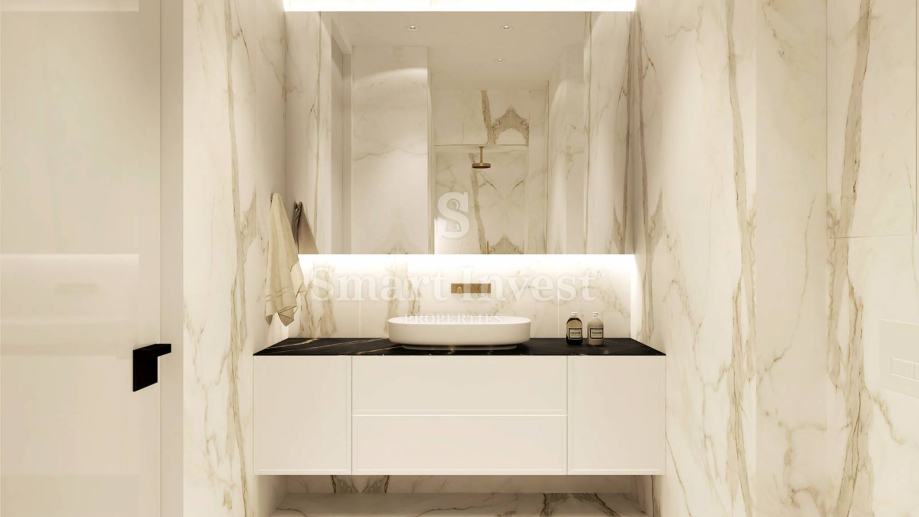 APARTMAN A1, površine 91.67 m2, kompletno opremljen dizajnerskim namještajem i vrhunskom tehnikom, nalazi se u prizemlju te sastoji od hodnika, dnevnog boravka s kuhinjom i blagovaonicom, 2 spavaće sobe svaka s vlastitom kupaonicom, te još jedne dodatne kupaonice.