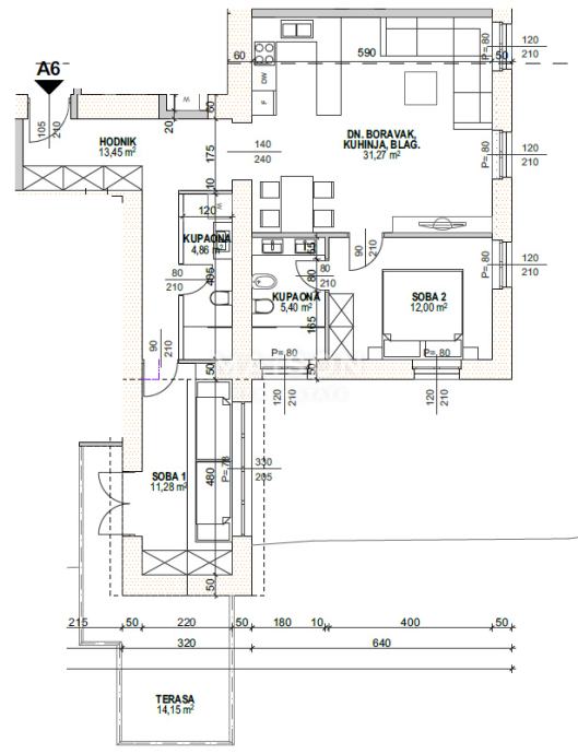 Stan se nalazi na 1. katu i obuhvaća hodnik, dvije kupaonice, dnevni boravak s kuhinjom i blagovaonicom, dvije spavaće sobe i balkon, ukupne površine 90,36 m². U kupaonicama je postavljeno električno podno grijanje, dok je u ostalim prostorijama instaliran fan-coil sustav grijanja i hlađenja koji omogućuje individualnu regulaciju temperature. Podovi su obloženi troslojnim hrastovim parketom, čime se dodatno naglašava toplina i elegancija prostora, dok drvena stolarija vjerno prati povijesni karakter zgrade te osigurava odličnu toplinsku i zvučnu izolaciju.