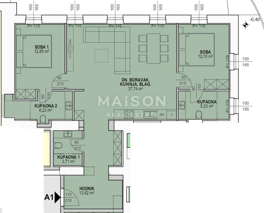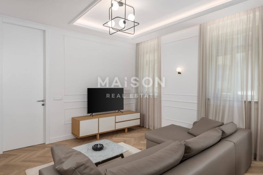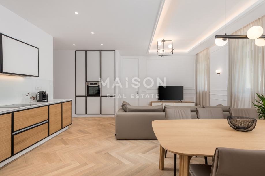 Stan se nalazi u prizemlju i obuhvaća hodnik, tri kupaonice, dnevni boravak s kuhinjom i blagovaonicom te dvije spavaće sobe, ukupne površine 91,67 m². U kupaonicama je postavljeno električno podno grijanje, dok je u ostalim prostorijama instaliran fan-coil sustav grijanja i hlađenja koji omogućuje individualnu regulaciju temperature. Podovi su obloženi troslojnim hrastovim parketom, čime se dodatno naglašava toplina i elegancija prostora, dok drvena stolarija vjerno prati povijesni karakter zgrade te osigurava odličnu toplinsku i zvučnu izolaciju.