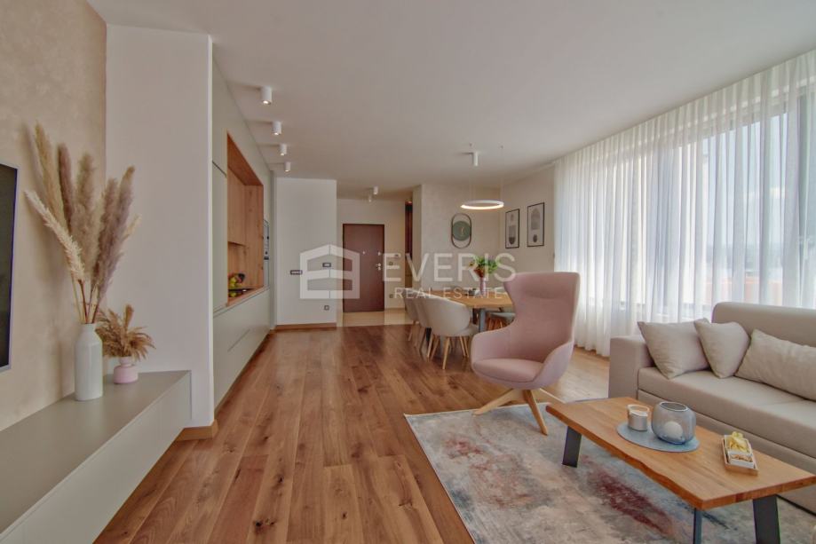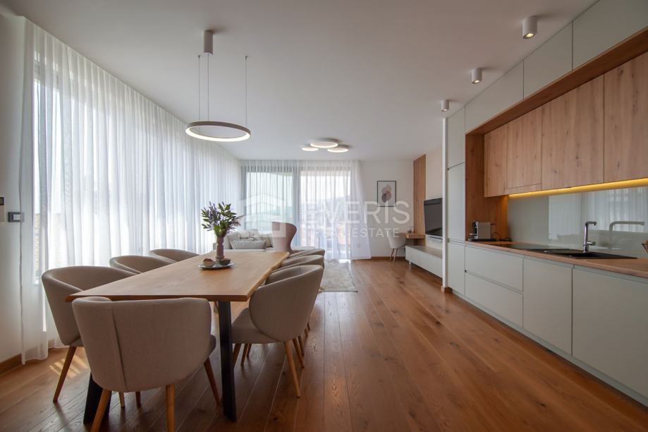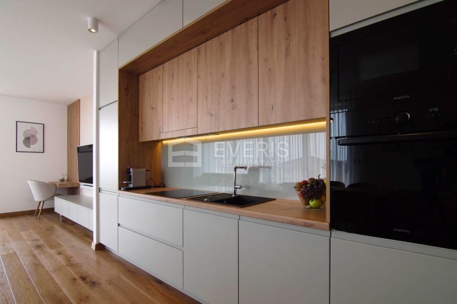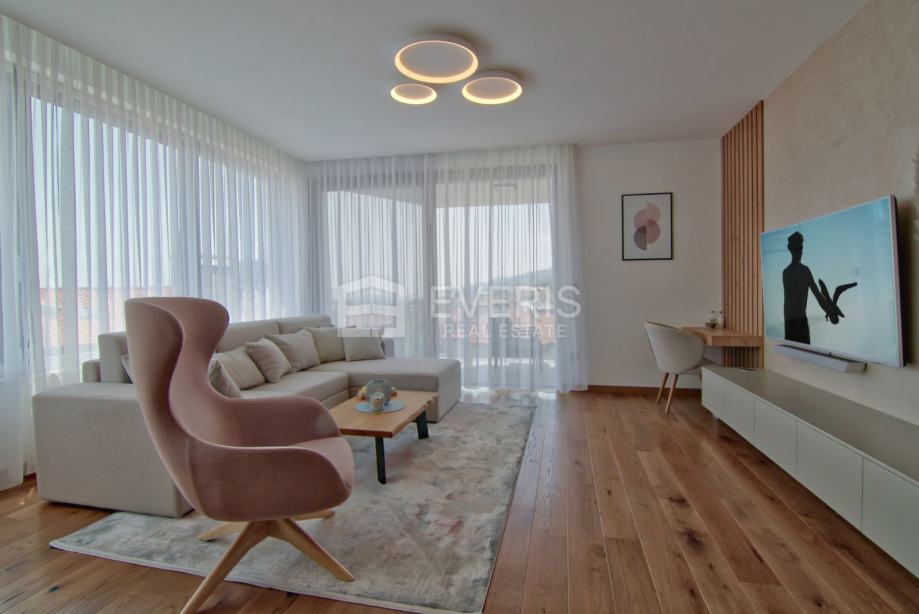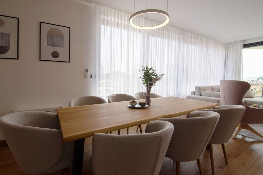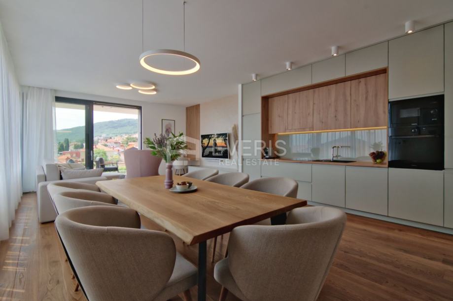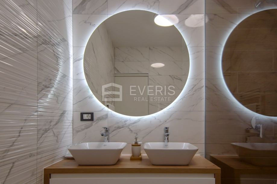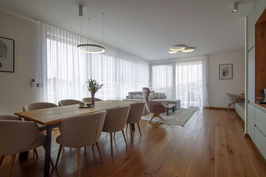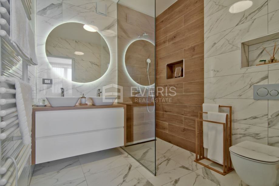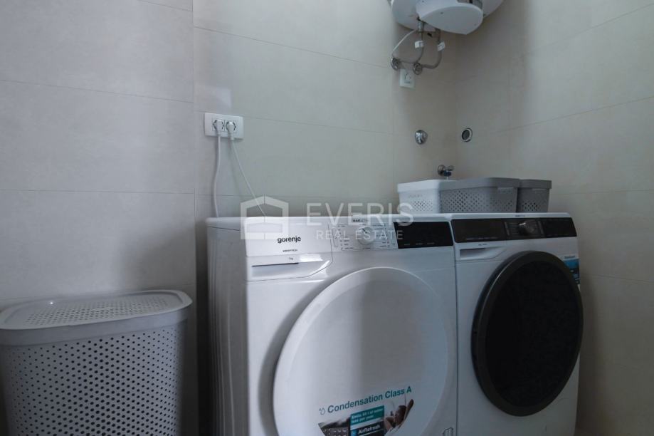 Grijanje - hlađenje putem podnih klima uređaja (Mitsubishi electric), podno grijanje u kupaonicama, vanjska stolarija Schucko s brisolejima na struju, kompletan interijer dizajniran i opremljen namještajem i uređajima, vanjska izolacija zgrade kamena vuna 15 cm - energetski certifikat zgrade A+.