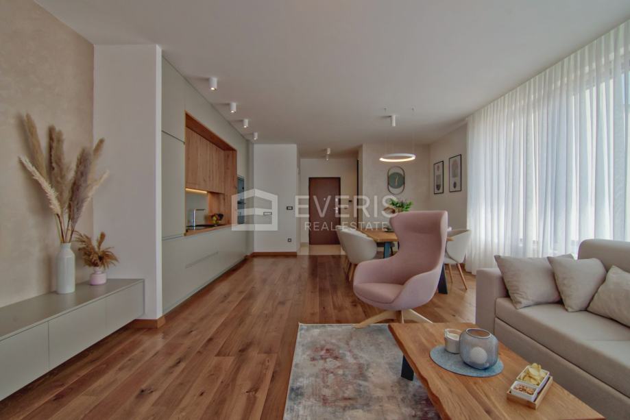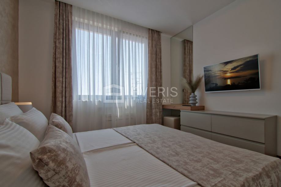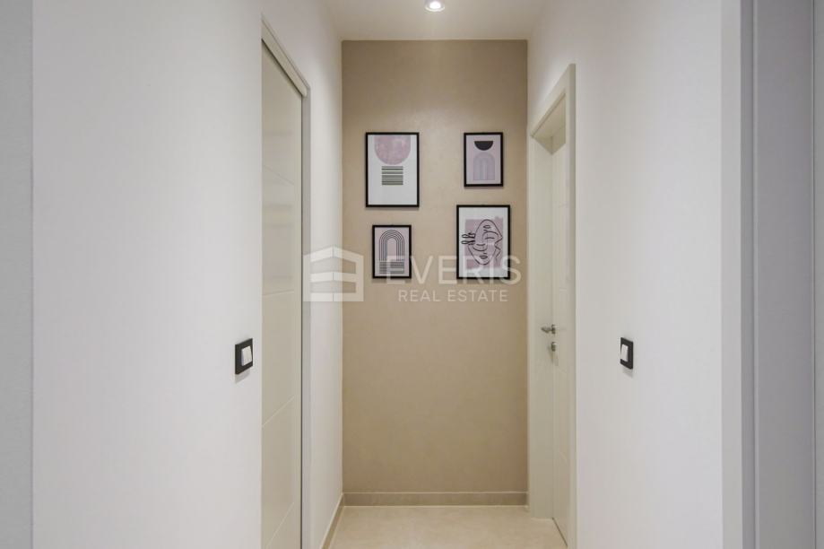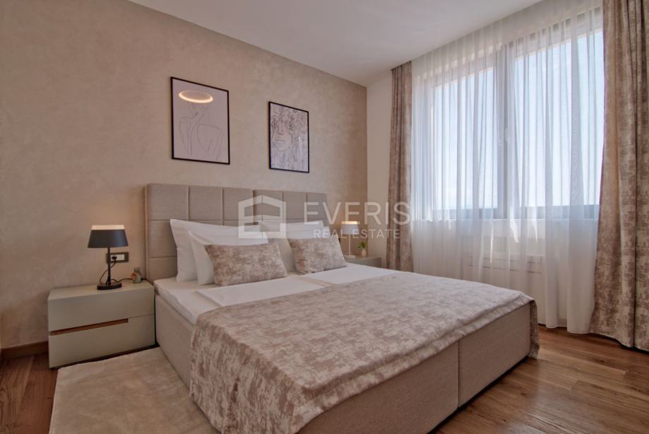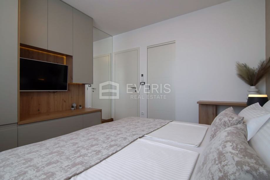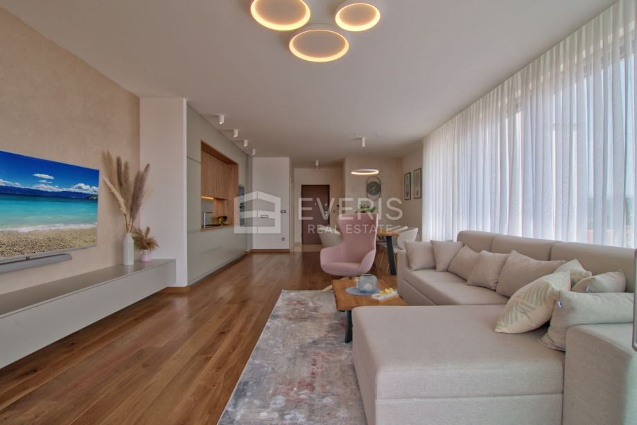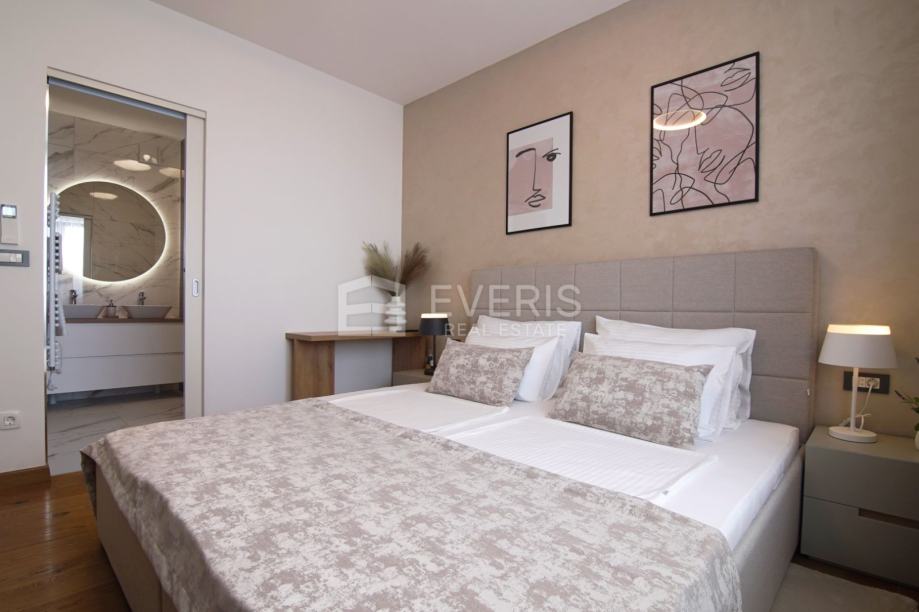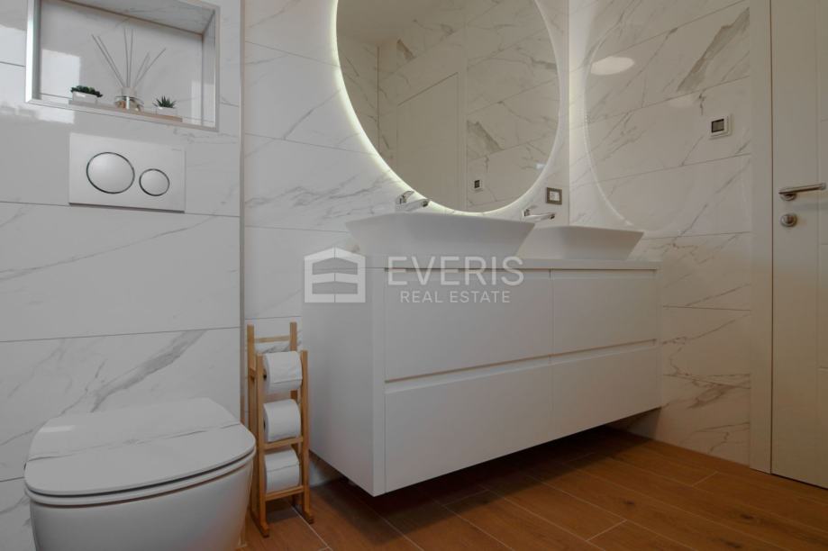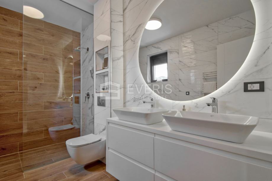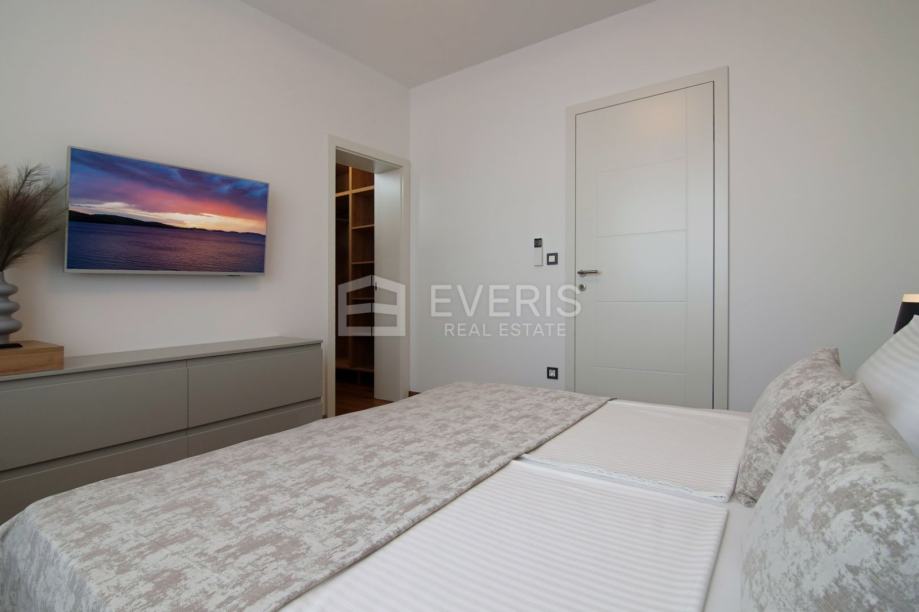 ▪ ulaznog hodnika, kuhinje - blagovaonice - dnevnog boravka - otvorenog tipa, dvije spavaće sobe, dvije kupaonice, vešeraja i balkona s pogledom na more.