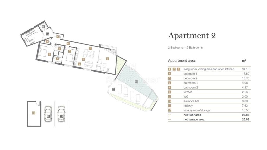 Na raspolaganju su vam ulazni hodnik, WC, prostrani dnevni boravak s kuhinjom i blagovaonicom povezan s prostranom terasom, dvije komforne spavaće sobe, svaka s vlastitom kupaonicom. Stanu također pripada spremište, jedno garažno parkirno mjesto i jedno vanjsko parkirno mjesto.