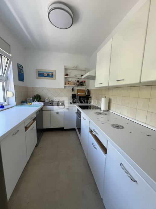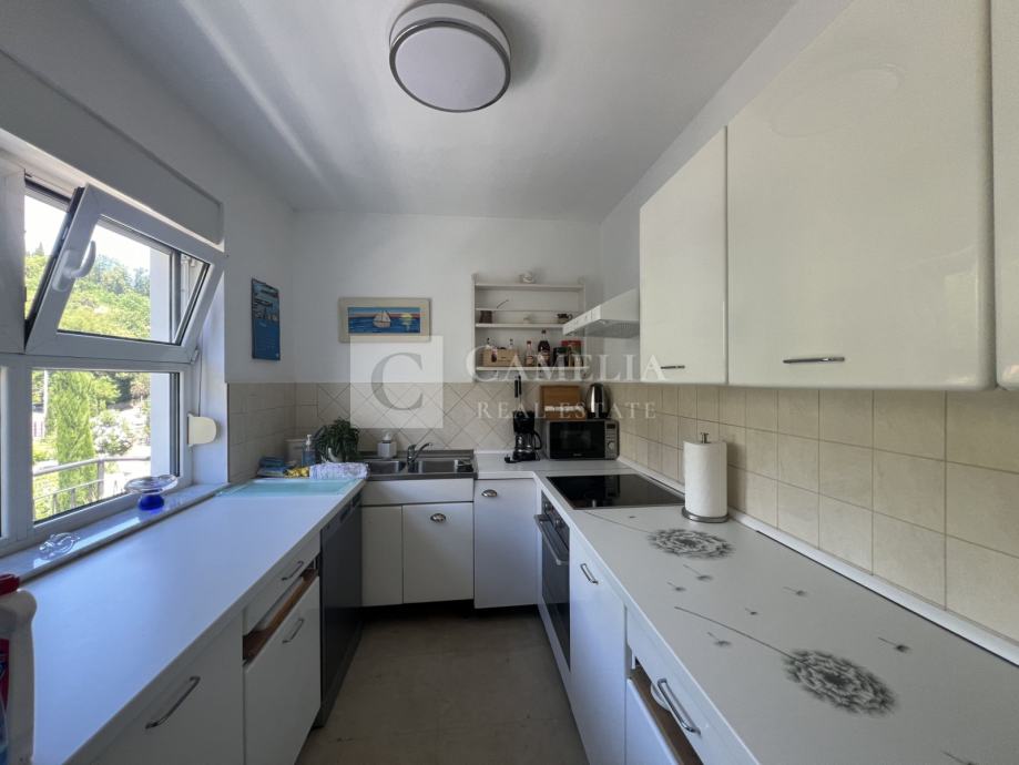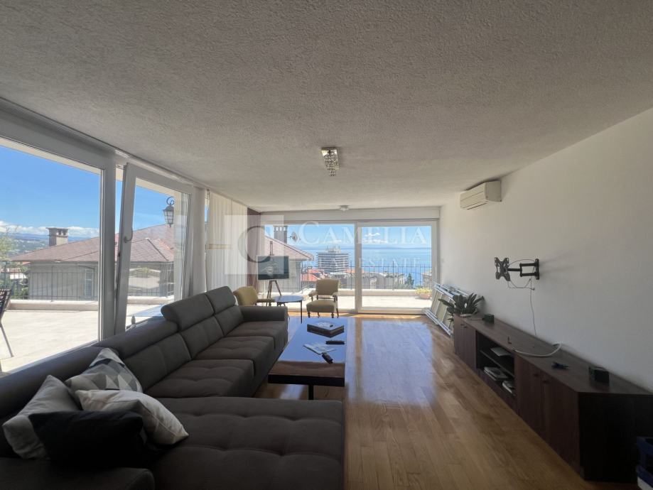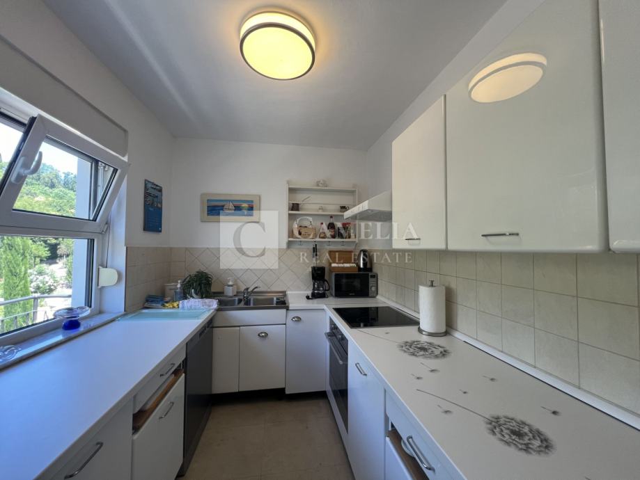 Kuhinja (sa izlazom na balkon) i blagovaona te mala ostava čine jednu cjelinu dok stanom dominira prostrani dnevni boravak koji se nalazi na kraju hodnika te ima izlaz na veliku terasu sa senzacionalnim pogledom na Opatiju i Kvarner.