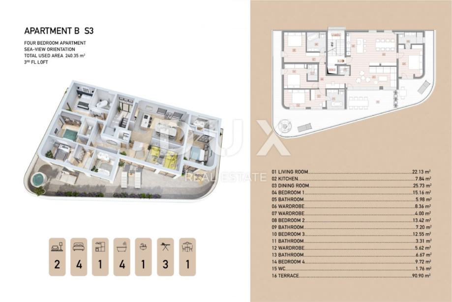 Smješten je na 3. katu zgrade, a riječ je o luksuznom četverosobnom stanu s ukupnom površinom od 240,35 m² i orijentacijom prema moru.