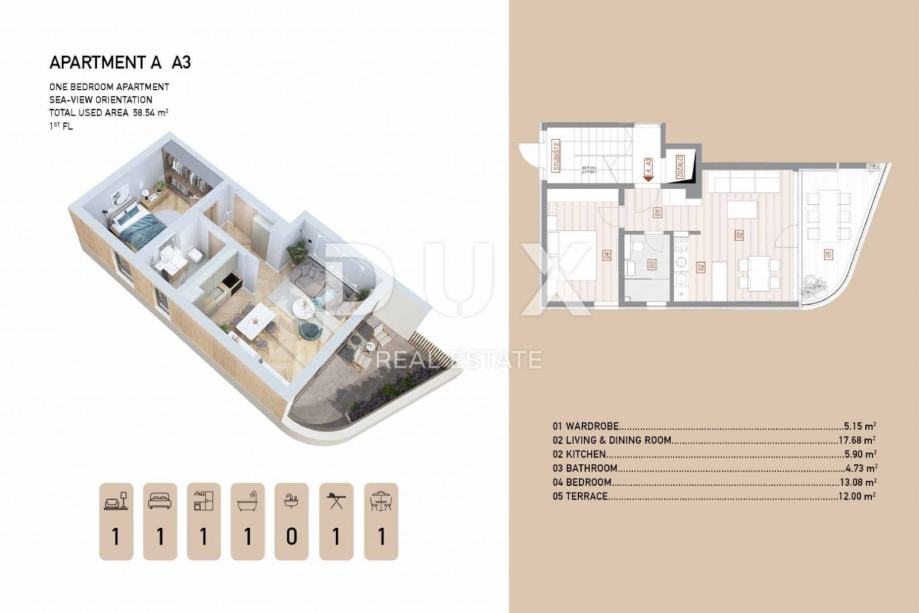 Nalazi se na prvom katu te ima ukupnu površinu od 58,54 m². Sastoji se od hodnika/garderobe (5,15 m²), dnevnog boravka s blagovaonicom (17,68 m²), kuhinje (5,90 m²), spavaće sobe (13,08 m²), kupaonice (4,73 m²) te natkrivene terase s pogledom na more površine 12,00 m².