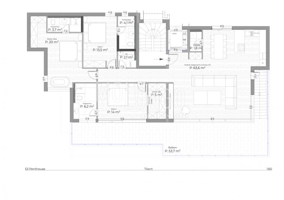 Penthouse se sastoji od hodnika, ostave, dnevnog boravka sa kuhinjom i blagovaonicom, tri sobe, tri kupaonice, nenatkrivene balkona i terase, ukupne korisne površine 183,87m2.