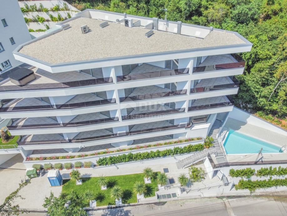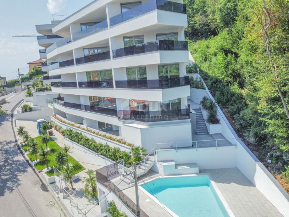 OPATIJA, CENTAR - prostrani stan u novogradnji s pogledom na more, zajednički bazen, garaža.