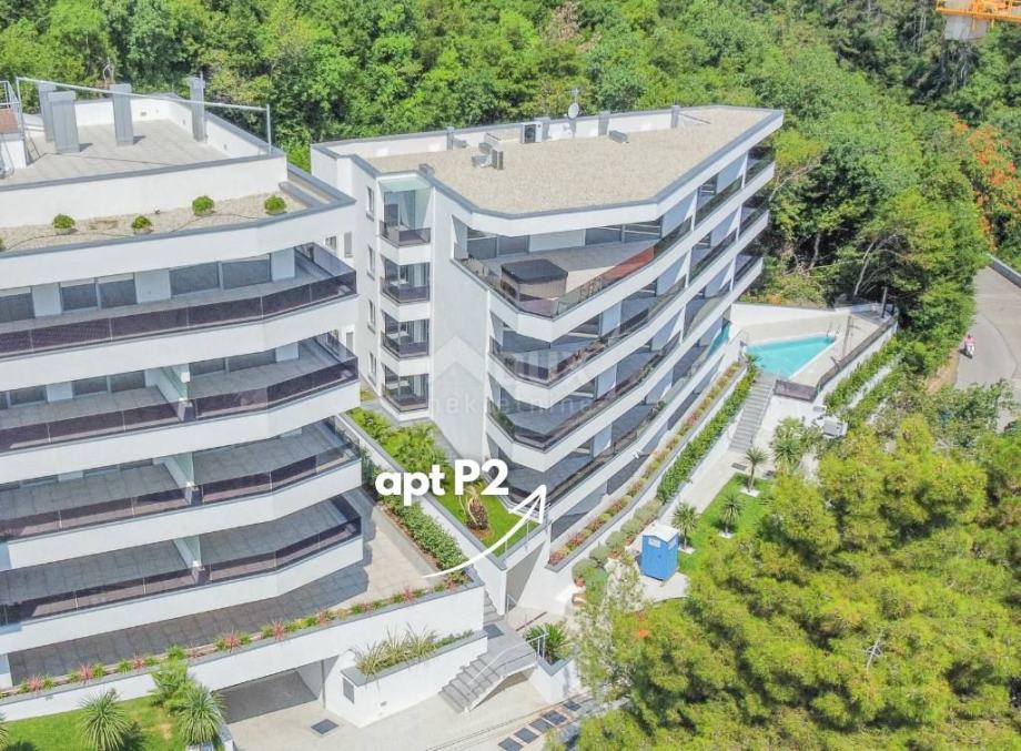 Posredujemo u prodaji prekrasnog modernog stana P2 površine 118,55 m2 iznad centra Opatije s panoramskim pogledom na more, terasom, vrtom, liftom i s dva parkirna mjesta.
