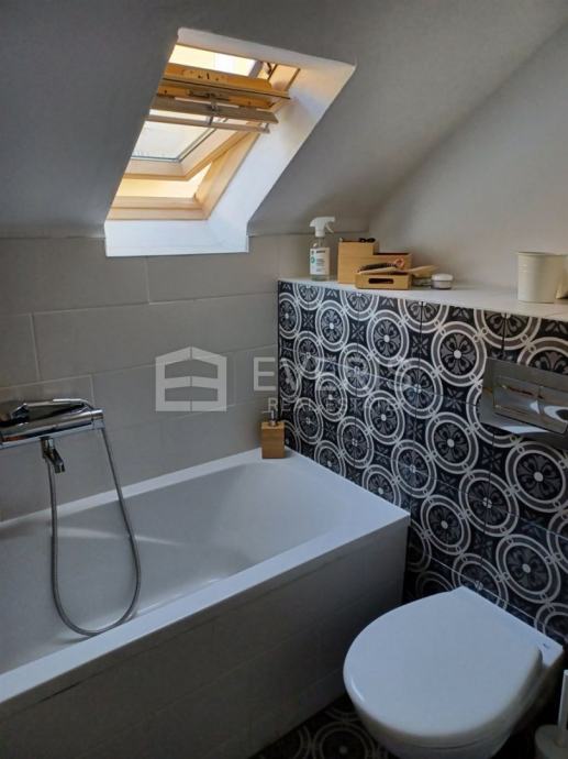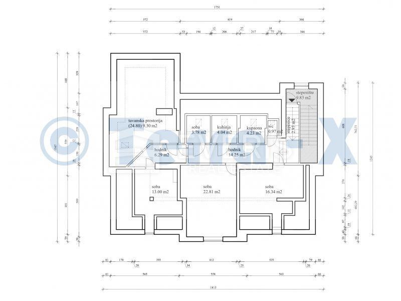 ▪ tri spavaće sobe, od kojih je jedna pretvorena u dječju sobu s prostorom za igru, dnevnog boravka, kuhinje s blagovaonom, kupaonice, toaleta, hodnika te tavanske prostorije površine 9,30 m2, sveukupne površine: 97,98 m2.