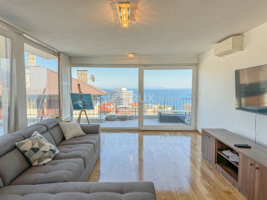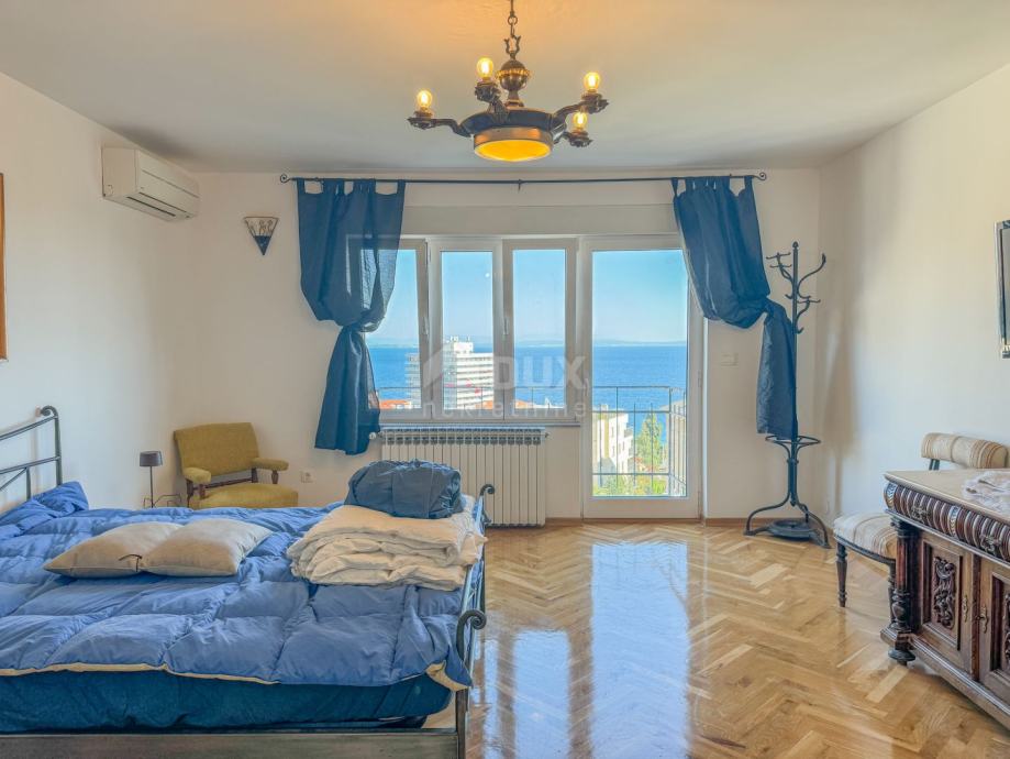 Ovaj prostrani stan od 200 m2 nudi tri udobne spavaće sobe, dvije kupaonice, tri osunčana balkona i prostranu južnu terasu od 60 m2 s prekrasnim pogledom na more. Stan je dobro uređen, a visoki stropovi pružaju dodatnu prozračnost i svjetlost. Interesantno je za istaknuti da se iz većinu prostorija garantira pogled na more.