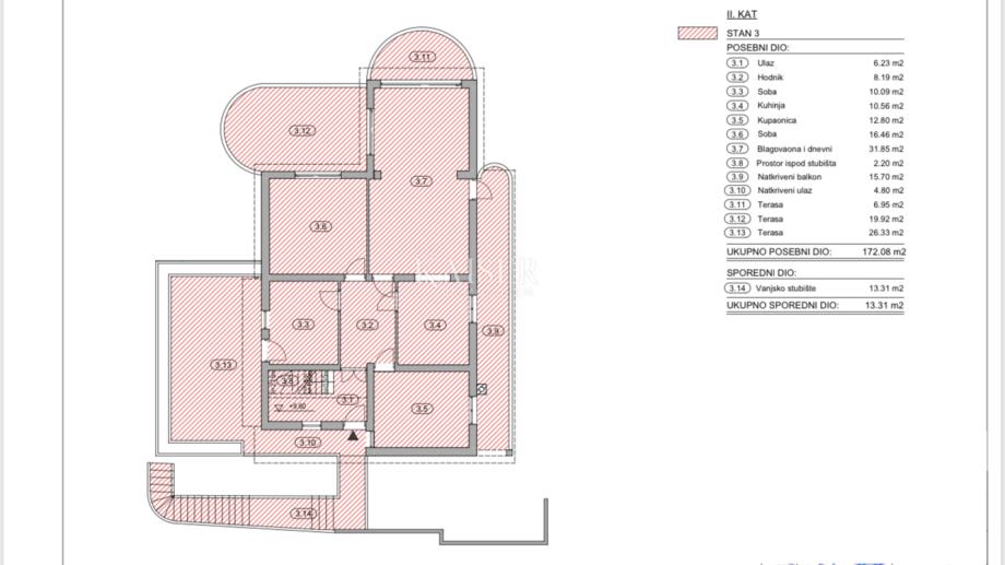 Tu je i sporedni dio koji uključuje vanjsko stubište na 2. katu površine 13,31 m2 te pripadak parkirno mjesto površine 12,50 m2.