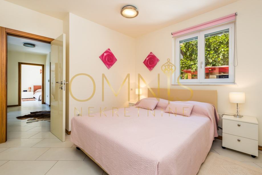 Apartman je moderno i luksuzno uređen, potpuno opremljen, a pripada mu i 180 m2 okućnice s hidromasažnom kadom, vanjskom kuhinjom, roštiljem i prostorom za druženje. Parking osiguran.