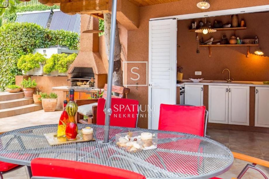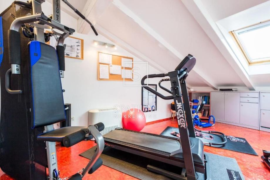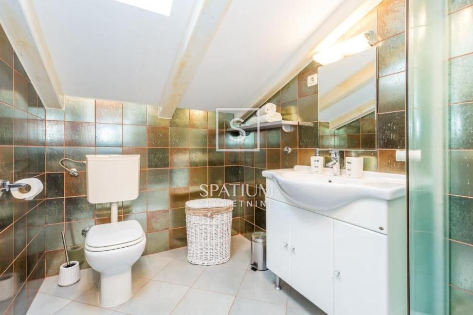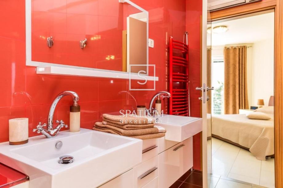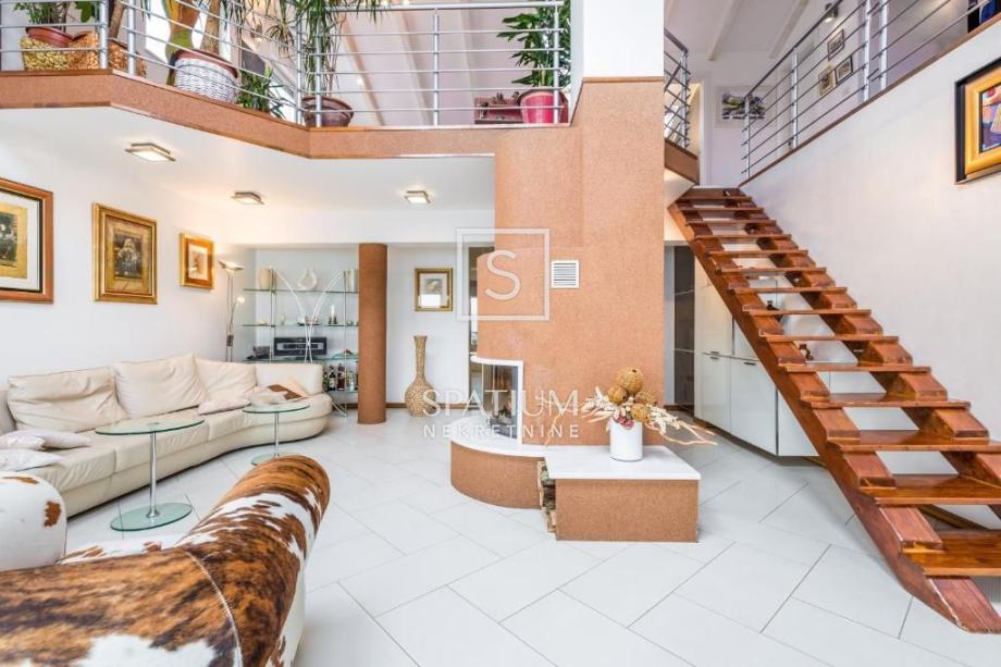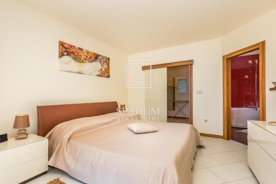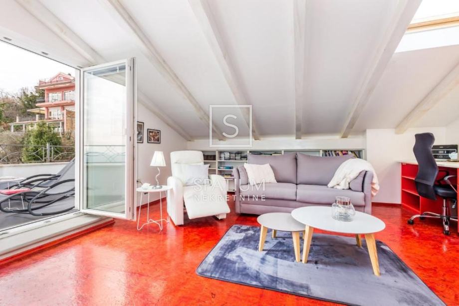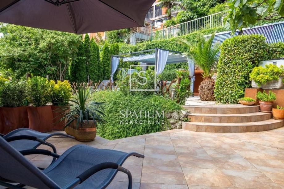 Ovaj ekskluzivni stan, nalazi se na drugom katu sa zasebnim ulazom kao i izravnim izlazom na okućnicu od 180 m2 na kojoj se nalazi ljetna kuhinja, jacuzzi i sunčalište. Sastoji se od tri spavaće sobe, tri kupaonice, zasebnog toaleta, dnevnog boravka, natkrivene loggie i terase od 80 m2. Na gornjoj etaži stana, pored spavaće sobe, nalazi se galerija s TV-om, fitnessom i dodatnim ležajem za dvije osobe – sve s pristupom na balkon i prekrasnim pogledom na more. Podno grijanje, klima uređaji, vrhunska stolarija, otvoreni kamin samo su neke od značajki ovog predivnog dvoetažnog stana. Pripada mu i jedno parkirno mjesto. Samo nekoliko minuta hoda do centra Opatije i na 150 m od poznatog opatijskog šetališta Lungomare, čine ovu lokaciju savršenom.