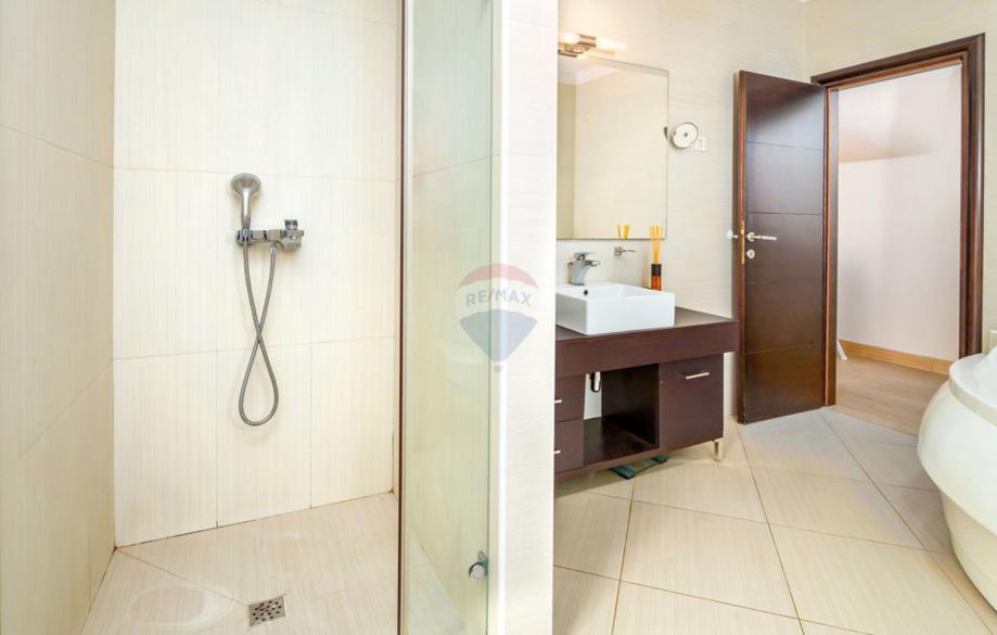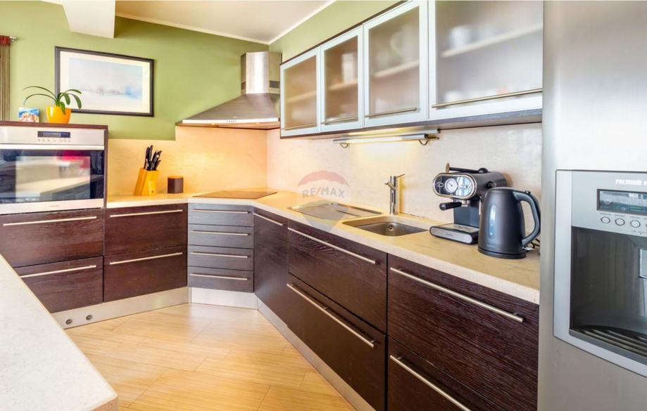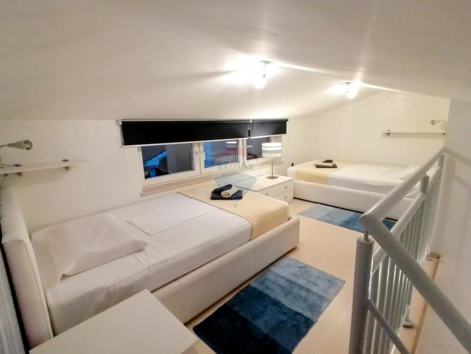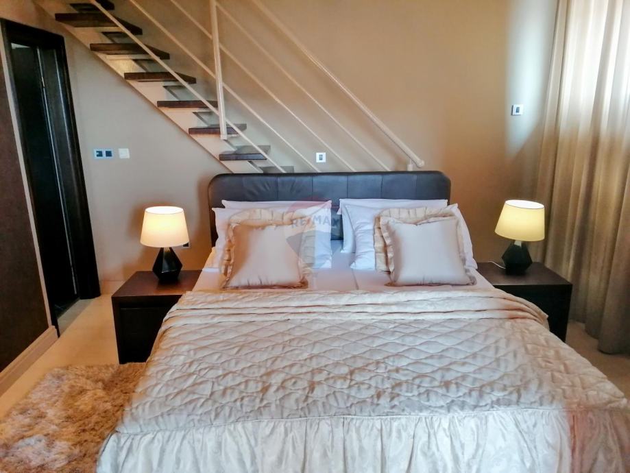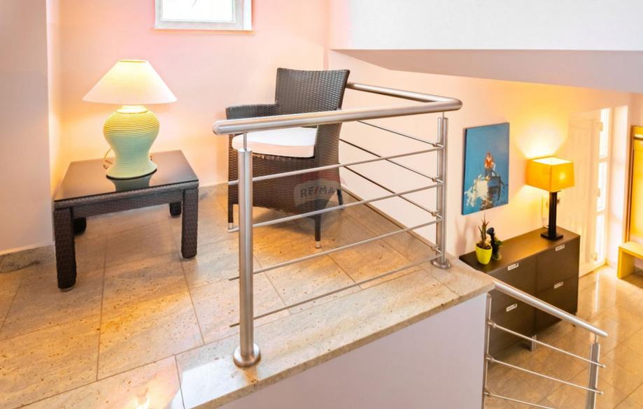 Prizemlje sačinjava dvoetažni stan površine 153 m2 sa prostranim dnevnim boravkom, blagovaonom i kuhinjom koji imaju izlaz na terasu. Na toj etaži je smještena spavaća soba i kupaona dok se na katu nalaze 3 spavaće sobe sa galerijom, kupaonama i balkonima.