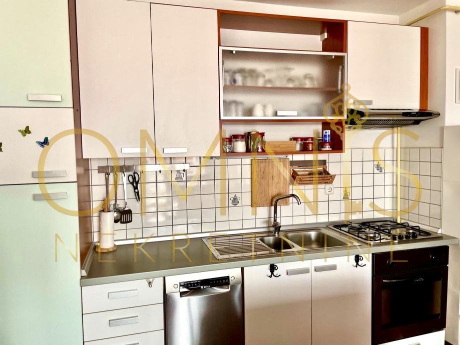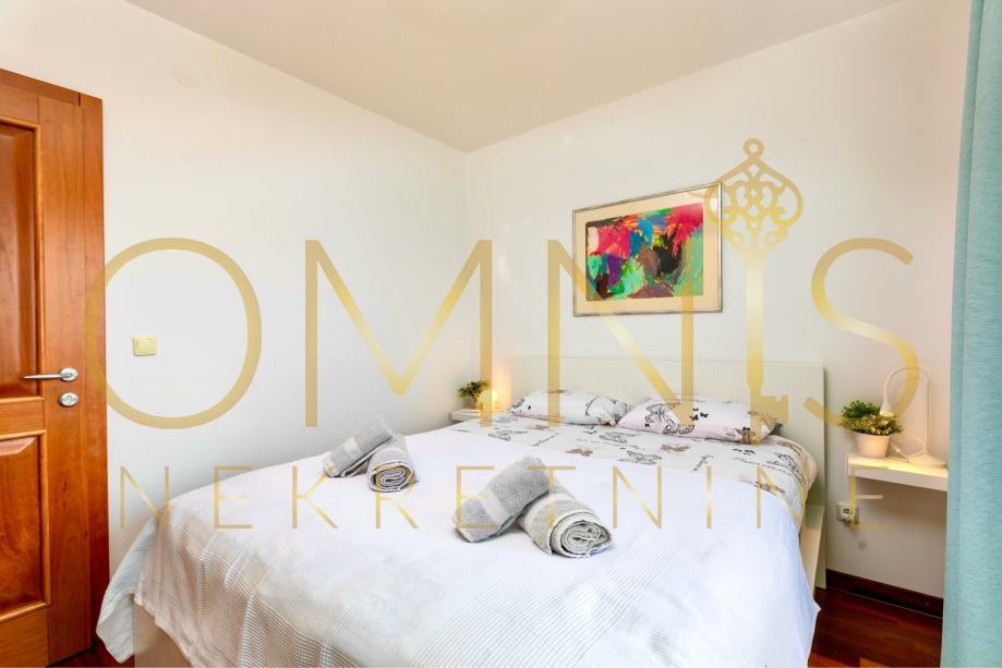 Unutrašnjost stana je potpuno opremljena – uključuje kuhinju s aparatima, perilicu posuđa, perilicu rublja, TV i krevet.