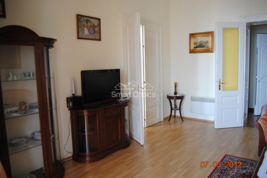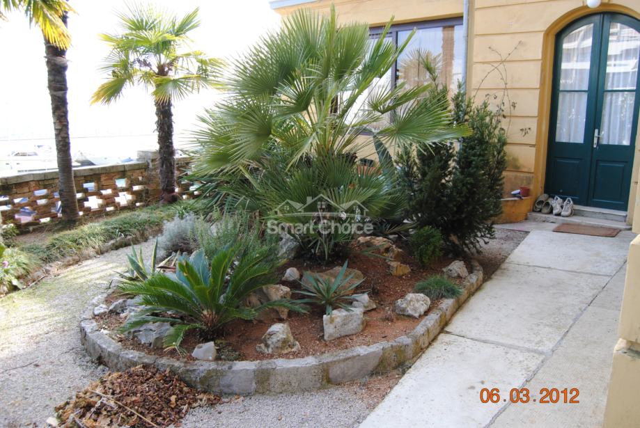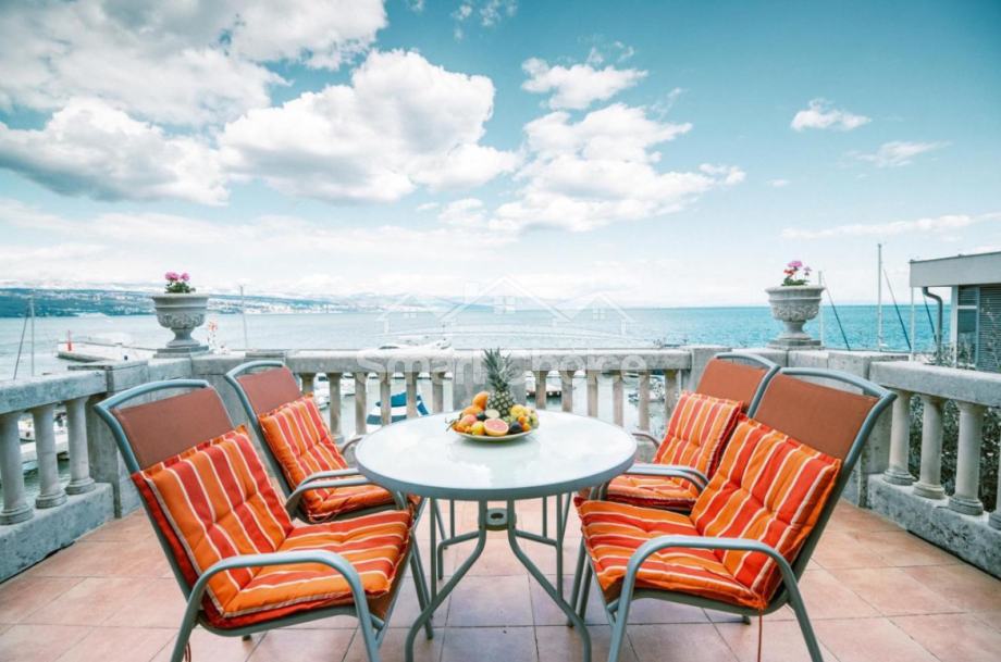 Opatija - etaža u ekskluzivnoj vili, 1. red do mora. Stan ima 172 m2 i sastoji se od tri sobe, dva dnevna boravka, dvije kuhinje s blagovaonama, dvije kupaone, verande i dva hodnika, ukupne neto korisne površine od 142,27 m2, s pripatkom terasa u visokom prizemlju zgrade i drvarnica, sve ukupne neto korisne površine od 28,73 m2, sveukupne površine 171,00 m2.