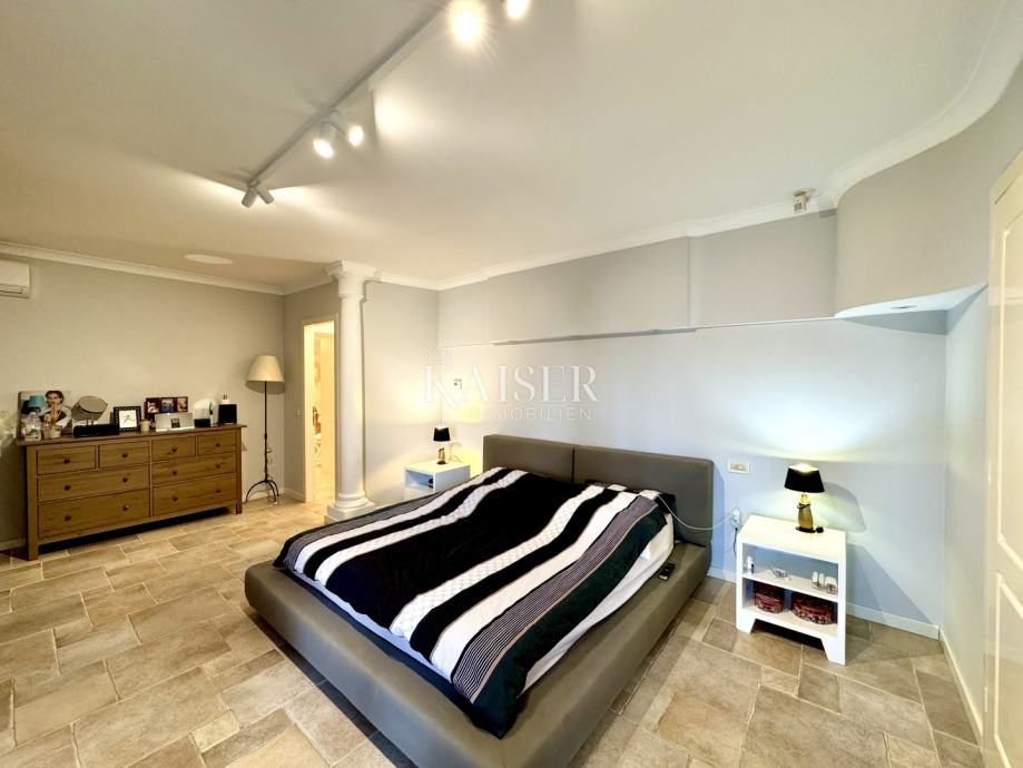 Vila se nalazi na povišenoj parceli s prekrasnim pogledom na more i marinu Ičići te u prizemlju, 1. katu i potkrovlju nudi ukupnu stambenu površinu od preko 320 m2 (uzimajući u obzir relevantne koeficijente 240 m2 neto). Vili također pripada dupla garaža s prekrasnom, stilski uređenom konobom i vlastitom kupaonicom (dodatnih cca 60 m2).