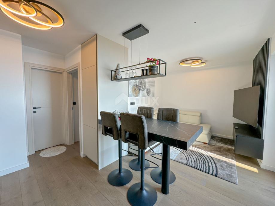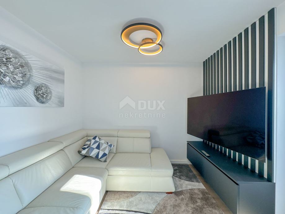 Stan se nalazi na 2. katu u novogradnji i prodaje se namješten. U stanu je postavljen kvalitetni parket, protuprovalna vrata, odlična unutarnja vrata cappuccino boje, a kupaonica ima podno grijanje. U cijelom stanu postavljena je stolarija po mjeri odnosno ugradbeni ormari čime je prostor maksimalno i ekskluzivno iskorišten. U prostoru prevladavaju tople boje te drveni ukrasni elementi.