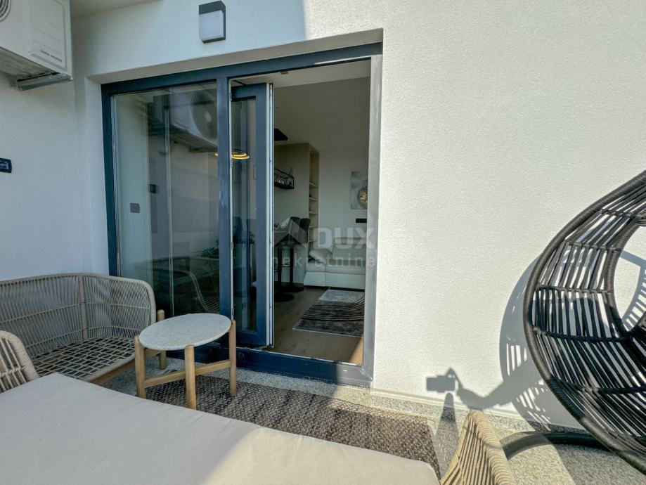 Projekt stambene zgrade ovog stana koncipiran je tako da svaki stan u zgradi ima potpunu privatnost, ne ometa susjede i ima direktni pogled na more. Velika prednost ove nekretnine je okućnica uređena egzotičnim i mediteranskim raslinjem te modernim betonskim strukturama.