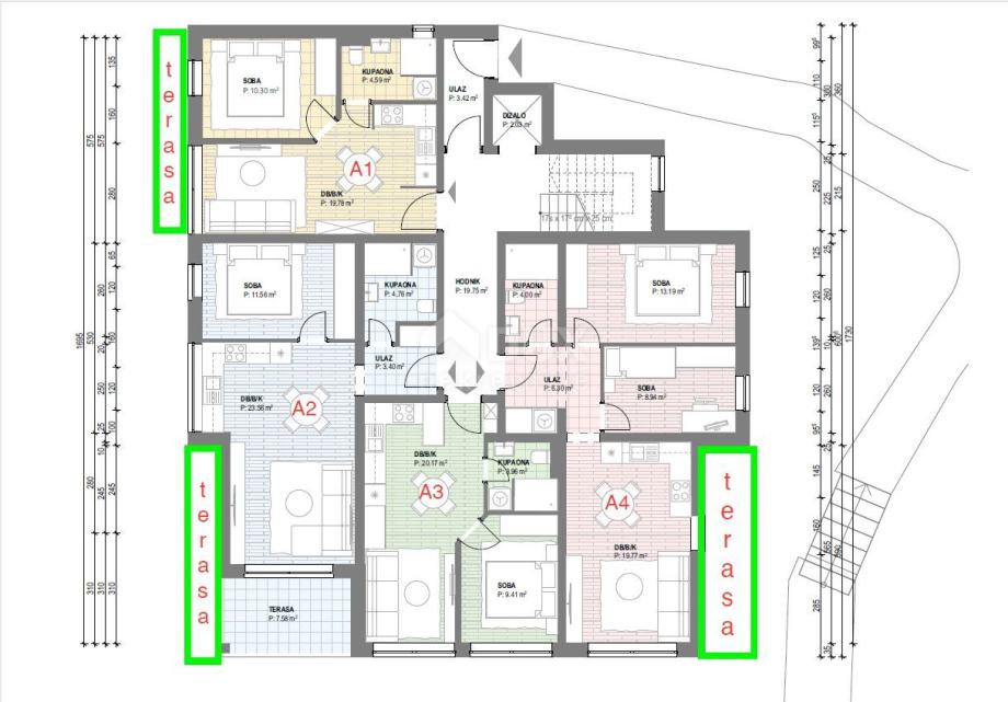Stan A2 veličine 56 m2 nalazi se na južnoj strani prizemlja novogradnje i sastoji se od hodnika, dnevnog boravka s kuhinjom i blagovaonicom, spavaće sobe, kupaonice i terase veličine 25m2 s djelomičnim pogledom na more. Iz terase možete doći do zajedničkog bazena i roštilja objekta.