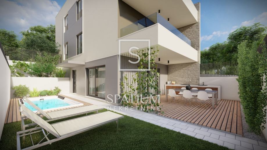 U prizemlju stana nalazi se dnevni boravak s kuhinjom i blagovaonicom, prostrani hodnik, gostinjski toalet te već spomenuti dodatni prostor namijenjen vešeraju ili ostavi. Iz dnevnog dijela izlazi se na veliku terasu okrenutu prema moru, gdje su već predviđene instalacije za vanjsku ljetnu kuhinju i nadzemni bazen – idealno za opuštanje, sunčanje i druženja na otvorenom, uz potpuni osjećaj privatnosti.