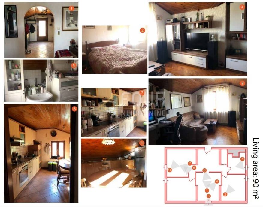 Stan u visokom potkrovlju je uređen, a rasporedom je 2-sobni s dnevnim boravkom i ima pripadajuću terasu.
