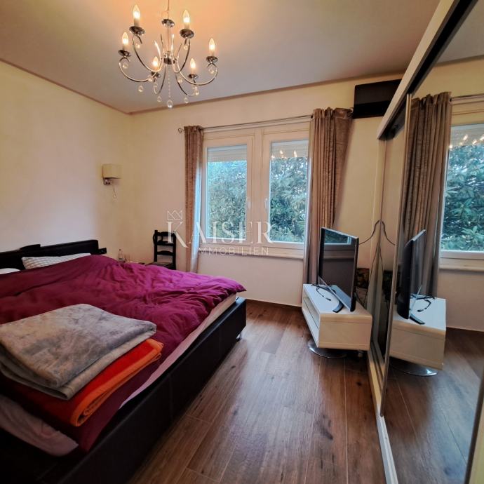 Iz sjedeće garniture u dnevnom boravku gledamo u more i zeleni okoliš. Stan ima podno grijanje i klimu. U okućnici kuće stanu pripada 1 parkirno mjesto.