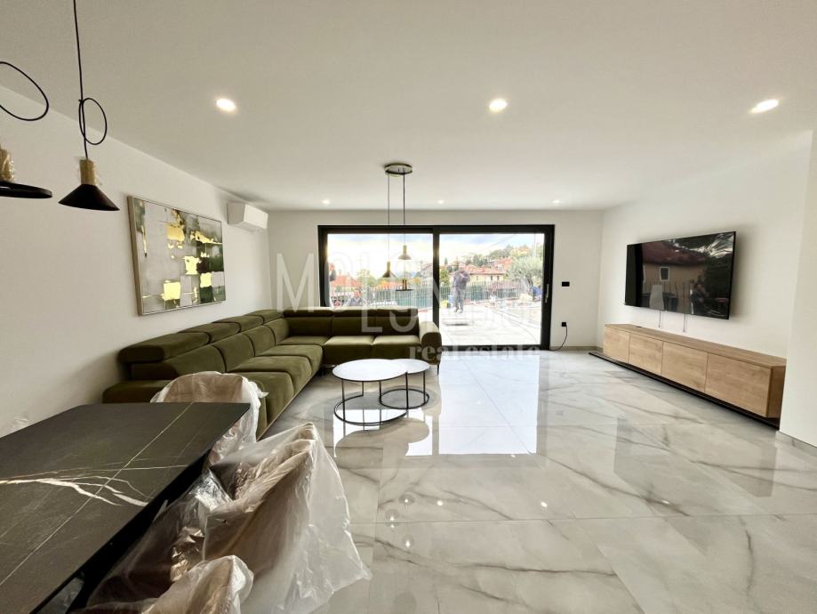 Prizemlje se sastoji od prostranog dnevnog boravka sa izlazom na terasu i okućnicu s bazenom, kuhinje sa blagovaonom, kupaone, hodnima i gostinjske spavaće sobe.