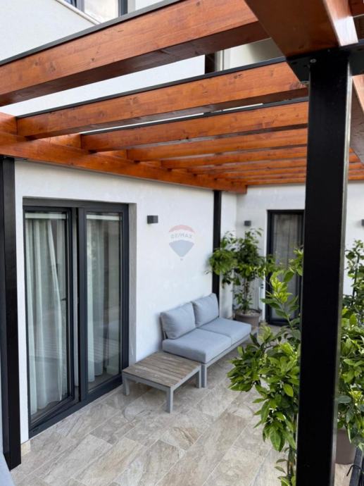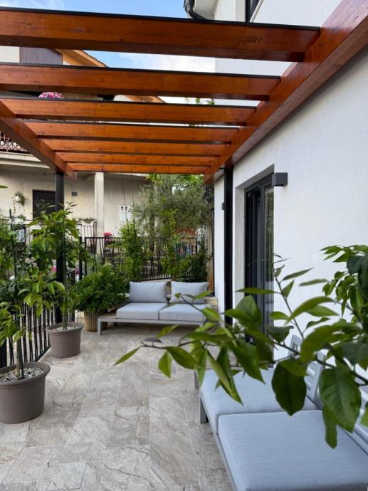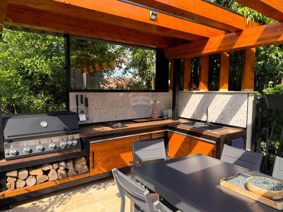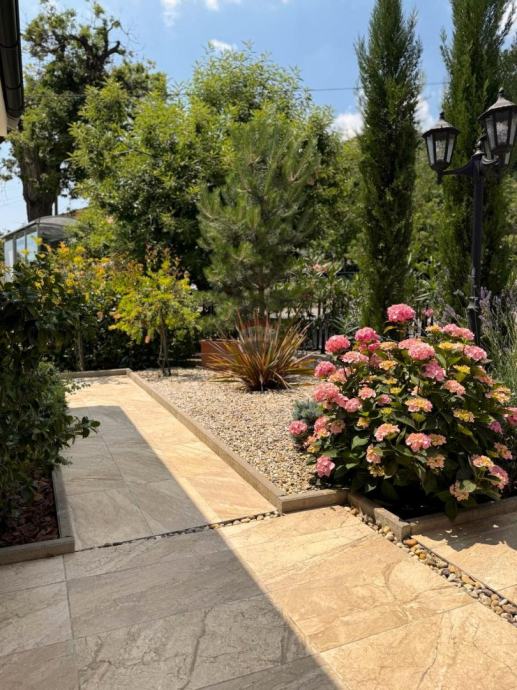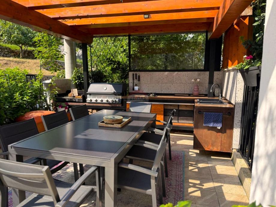 Okućnica je s ukusom i puno detalja uređena, kompletno je ograđena, a u sklopu nje se nalazi: ljetna kuhinja s roštiljem, prostorom za druženje i pergolom, predivan mediteranski vrt i vanjsko spremište.