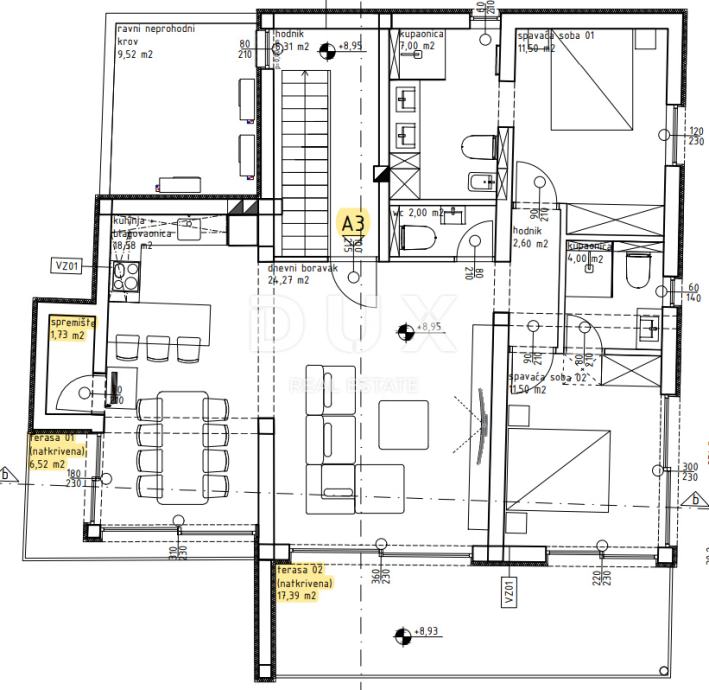 Predmetni stan prostire se na 107,09 m² ukupne stambene površine. Unutarnjem prostoru površine 83,18 m² pripadaju dvije natkrivene terase (6,52 m² i 17,39 m²).