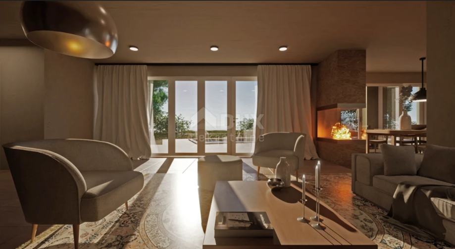Dnevni boravak u prizemlju ima pogled na bazen i more. Između dnevnog boravka i prostrane otvorene kuhinje s blagovaonom nalazi se otvoreni kamin koji je vidljiv s obje strane.