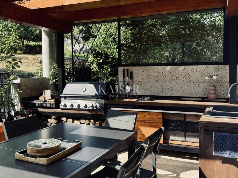 Što se same kuće tiče, riječ je o nekretnini koja je novoizgrađena od temelja na mjestu bivše kamene kuće, što znači da se savršeno uklapa i stapa s okolinom.