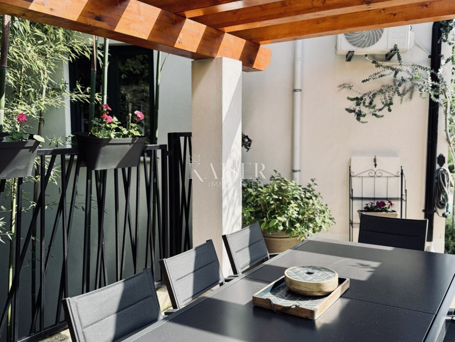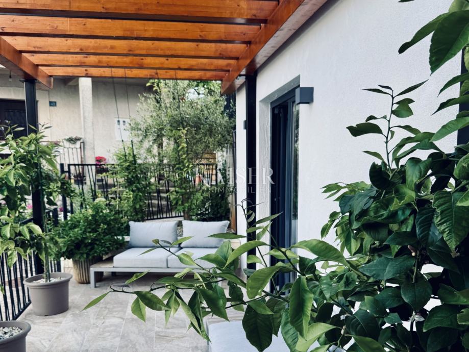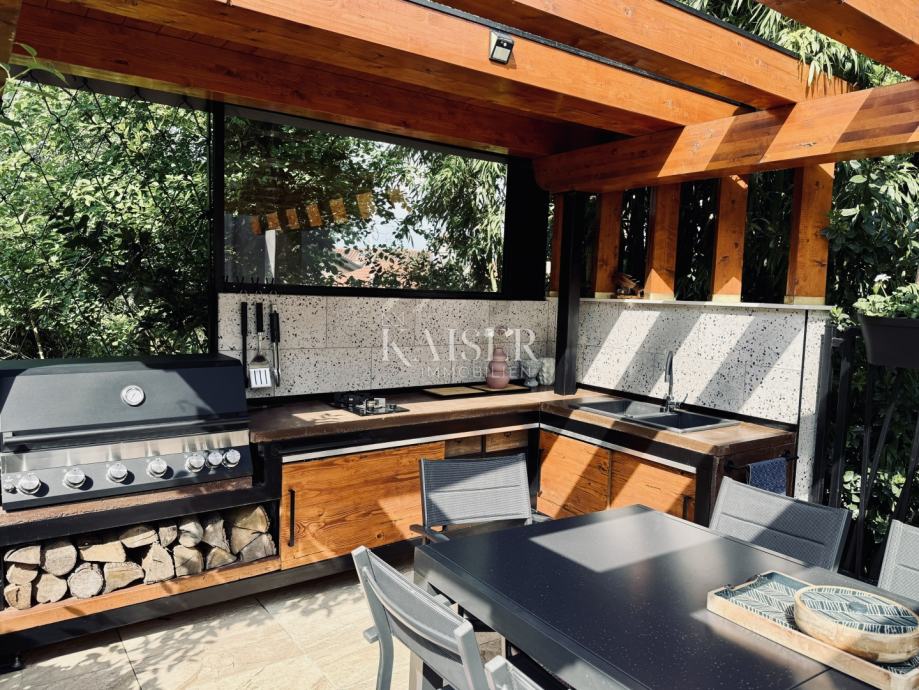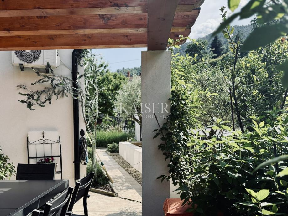 Ispred kuće se nalazi manji predivno uređen vrt s puno mediteranskog zelenila, i kuća ima stoga više karakter stana s dodatnim vanjskim prostorom, što je koncept vrlo pogodan za povremeno / sezonsko korištenje ili idealan za ljude koji ne žele ili ne mogu posvetiti previše vremena brizi o okućnici. Međutim na raspolaganju je više nego dovoljno prostora uključujući prekrasnu ljetnu kuhinju s roštiljem, pergolu sa sjedećom garniturom i vrlo praktično spremište. S morske strane kuća ima i dvije velike terase, tako da zaista nema nedostatka prostora na otvorenom.