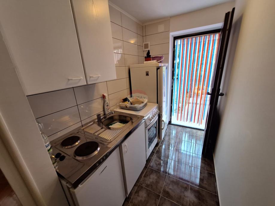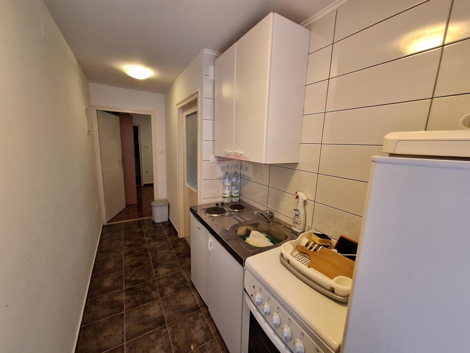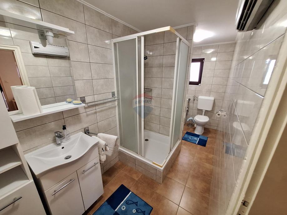 Stan u prizemlju je jednosobni, a na katu je smješten trosobni stan s dnevnim boravkom s izlazom na veliku natkrivenu terasu.