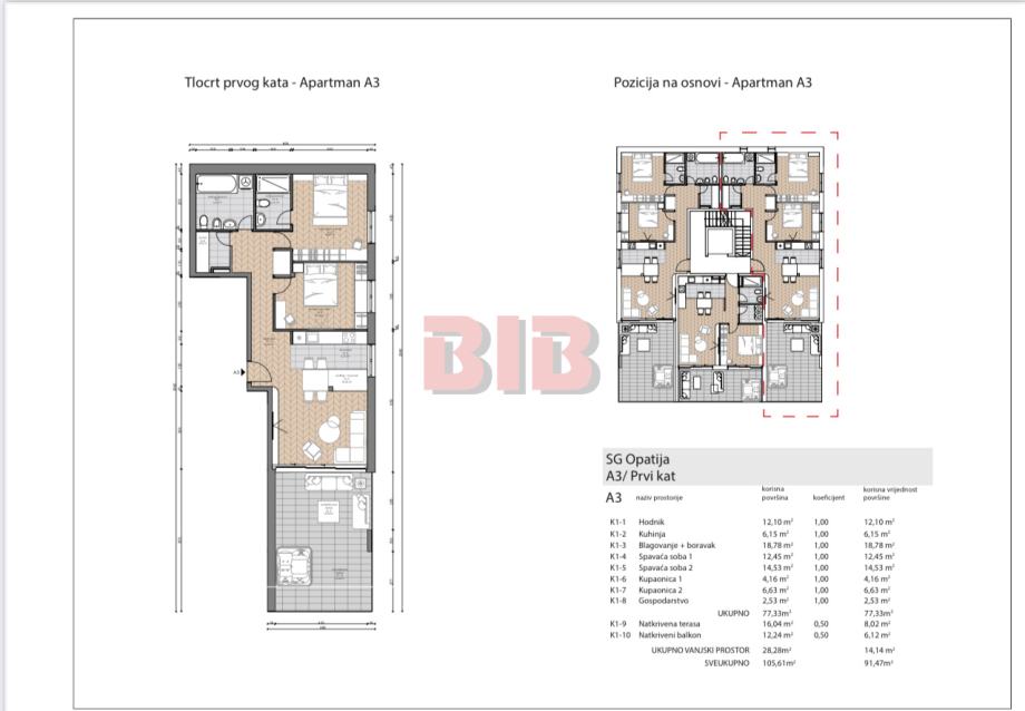 Stan se sastoji od hodnika,dvije spavaće sobe,dvije kupaonice,kuhinje,dnevnog boravka,gospodarstva,natkrivene terase i natkrivenog balkona,ukupne korisne površine 91,47m2,te garažnog mjesta pobršine 15m2( 15x05=7,5m2) i spremišta površine 5m2( 5x05= 2,5m2),sveukupne korisne površine 101,47m2.Vrhunska gradnja i oprema,grijanje dizalicom topline,kvalitetna keramika,sanitarije i podne obloge,alu stolarija,lift.U tijeku gradnja.Predviđeni rok završetka kraj ove godine.