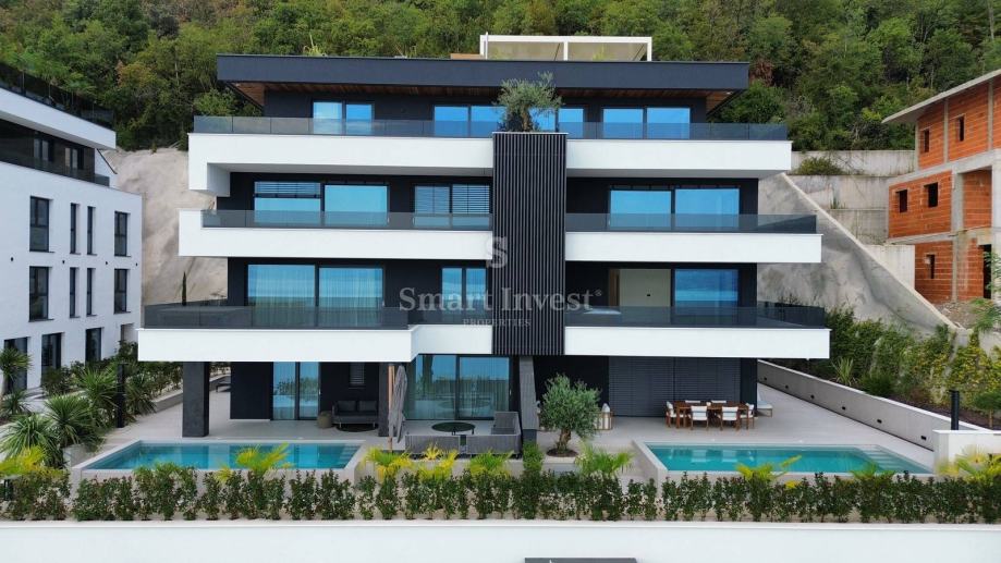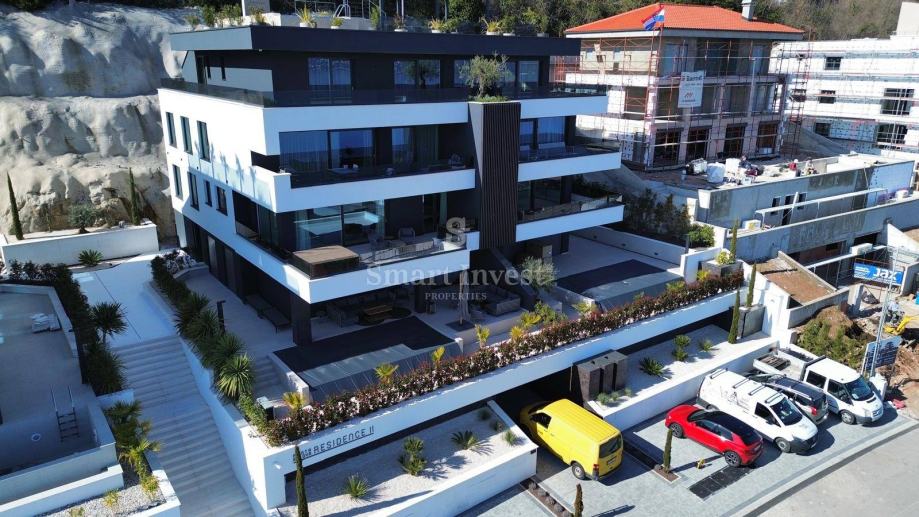 Vrhunska novogradnja sa 7 luksuznih stanova i podzemnom garažom nalazi se na iznimnoj lokaciji s koje se pruža otvoreni pogled na more, svega 250 m udaljena je od mora te 10 minuta lagane šetnje do strogog centra Opatije.
