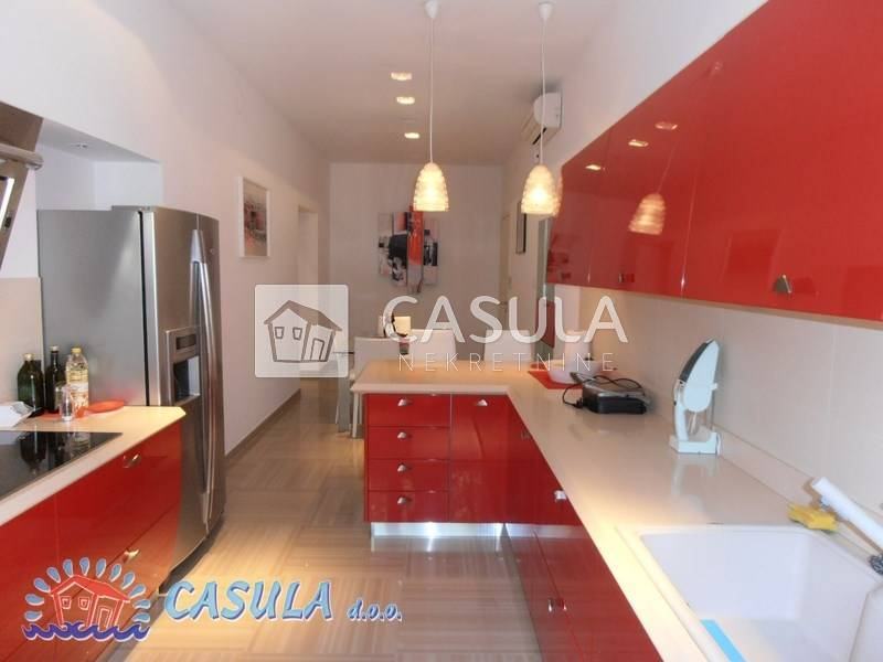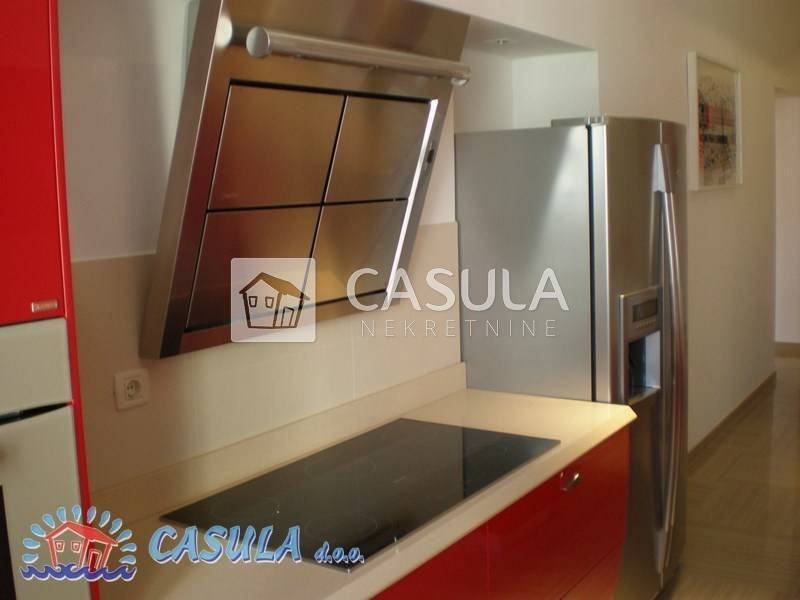 STAN JE NEDAVNO IZ TEMELJA UREĐEN A PRI UREĐENJU PAZILO SE NA SVE DETALJE. KOMPLETNA STOLARIJA RAĐENA JE PO MJERI (ARIŠ). MODERAN NAMJEŠTAJ VRHUNSKE KVALITETE. SA TERASA SE PRUŽA PREKRASAN POGLED NA MORE. U SKLOPU OKUĆNICE STAN IMA LJETNU KUHINJU S VELIKOM TERASOM (35 M2). PRVORAZREDAN STAN. GARAŽA 13 m2.