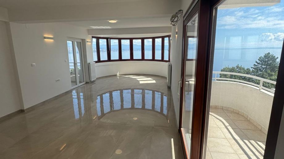 Posebnosti: kompletno renoviran stan – nove instalacije, podovi i keramika, prostrane i svijetle prostorije, polukružna lođa s panoramskim prozorima i spektakularnim pogledom na Kvarner, kvalitetna stolarija i moderna kupaonica. Ukupna površina s pripadcima: 217 m2.