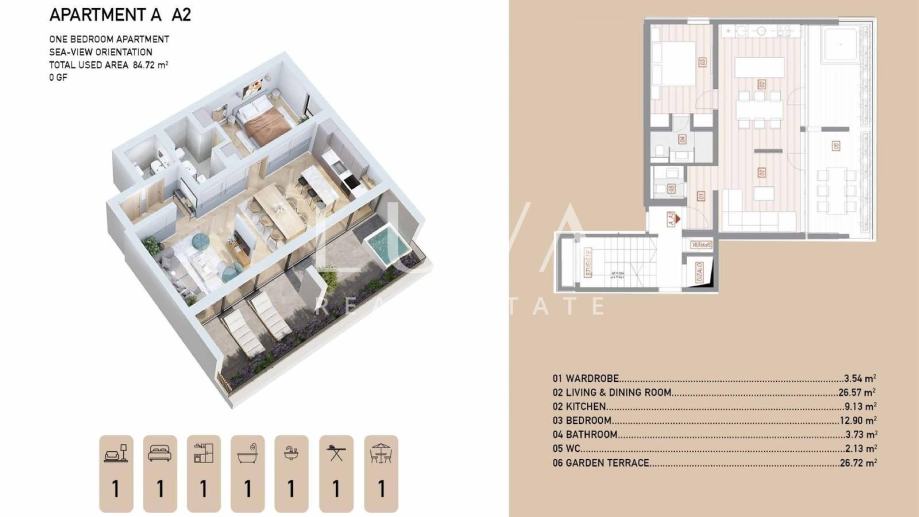 Sastoji se od dnevnog boravka, blagovaonice s kuhinjom, jedne spavaće sobe sa svojom kupaonicom, jedne garderobe, velike terase i toaleta.