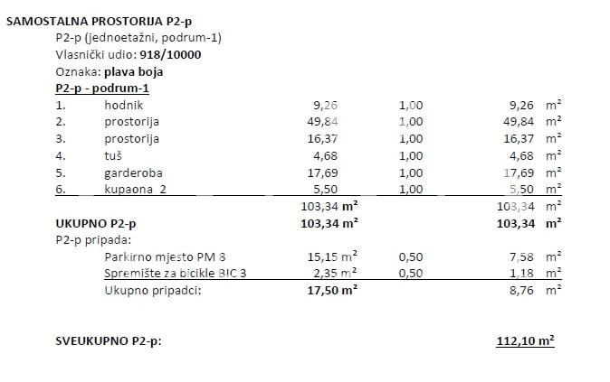 Stan se prostire na ukupnoj površini od 112,10 m² (izraženo s koeficijentima), dok unutarnja površina iznosi 103,34 m². Sastoji se od dvije prostorije, tuša, garderobe i kupaonice. Prostor je prostran i fleksibilan, što omogućuje različite mogućnosti korištenja — može poslužiti kao stambeni, poslovni, rekreativni ili pomoćni prostor prema potrebama budućeg vlasnika.