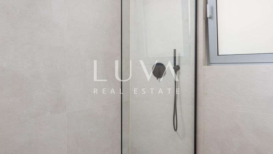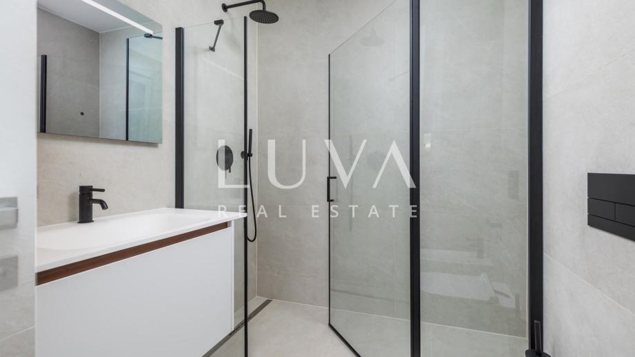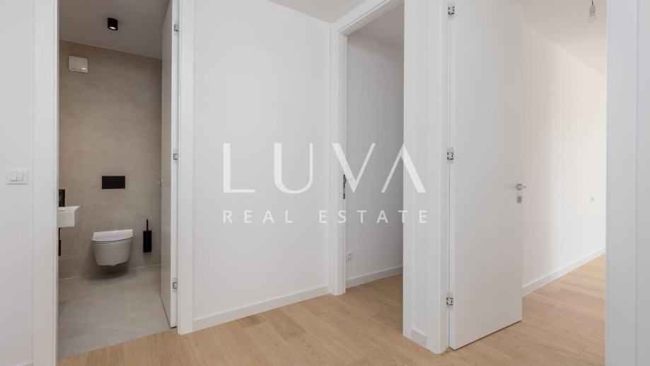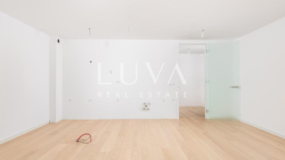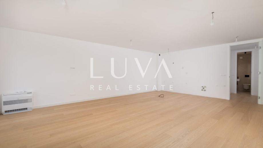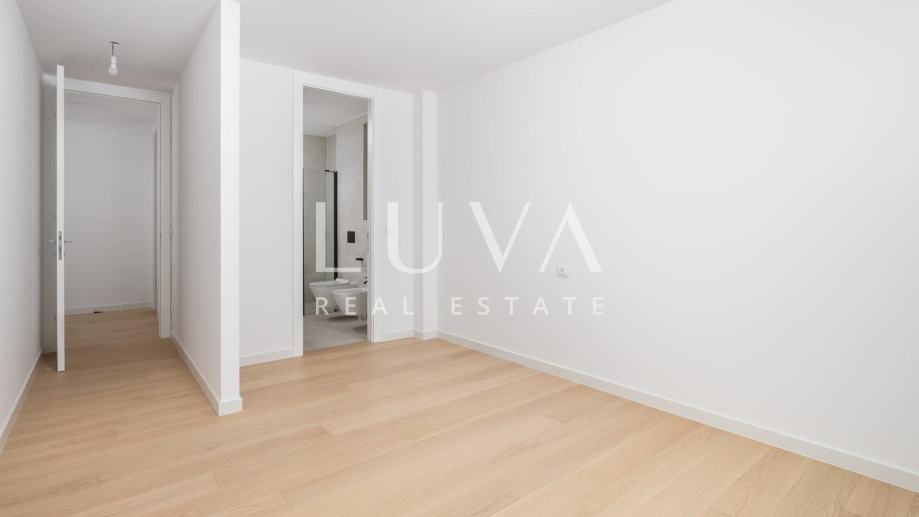 Stan se prostire na ukupnoj površini od 125,81 m² (izraženo s koeficijentima), dok bruto površina iznosi 131,82 m². Unutarnji stambeni prostor površine 93,90 m² obuhvaća dvije spavaće sobe, dvije kupaonice i dodatni toalet. Interijer je pažljivo osmišljen s naglaskom na udobnost, funkcionalnost i estetiku, uz korištenje vrhunskih materijala i modernih završnih detalja.