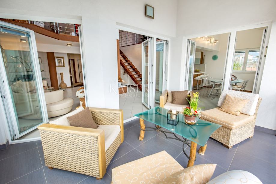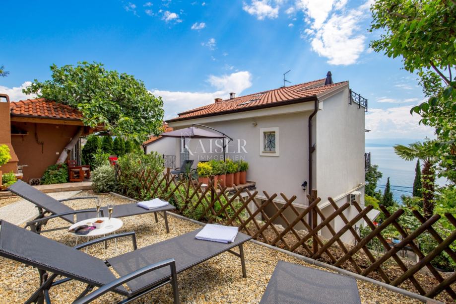 Iz svoje ponude, Kaiser Immobilien izdvaja luxuzni stan sa veličanstvenim pogledom na Kvarner u Opatiji. Etaža ima poseban ulaz okružen zelenim područjem i terasom od 180 m2. Dvoetažna nekretnina se sastoji od tri spavaće sobe, svaka s izlazom na balkon, dnevnog boravka s kaminom i terasom, kuhinjom s pripadajućim balkonom i tri kupaonice. Na ulazu u etažu je smještena još jedna prostorija s wc-om i vešerajem.