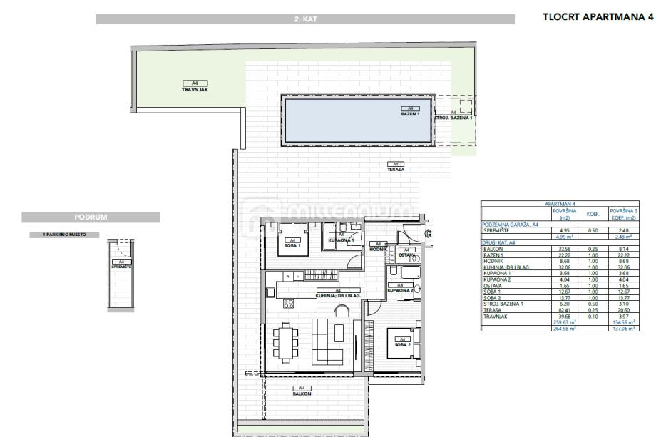 Stan je jugozapadne orijentacije i pripada mu jedno garažno parking mjesto.