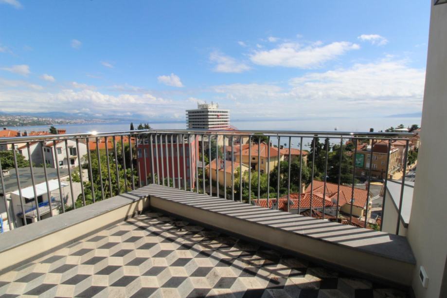 OPATIJA - moderan, luksuzan, dvosobni stan s dnevnim boravkom i terasom od 11 m2 s pogledom na more i Opatiju, smješten je na 4. katu kvalitetne novogradnje u centru Opatije.