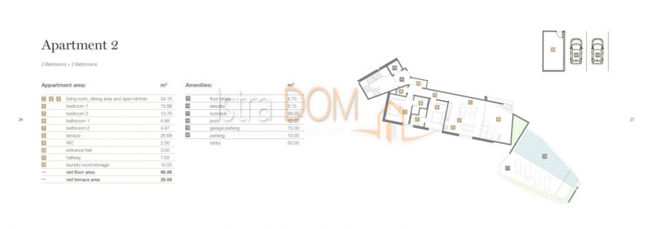 Ovaj prostrani stan nudi savršen spoj udobnosti i luksuza, idealan za obitelji ili one koji traže mirno okruženje s prekrasnim pogledom. S dvije spavaće sobe i dvije kupaonice, svaka s vlastitim sadržajima, pruža privatnost i funkcionalnost. Dnevni boravak s kuhinjom i blagovaonicom stvara otvoreni prostor koji je savršeno povezan s terasom, čime se omogućuje uživanje u vanjskom prostoru tijekom cijele godine.